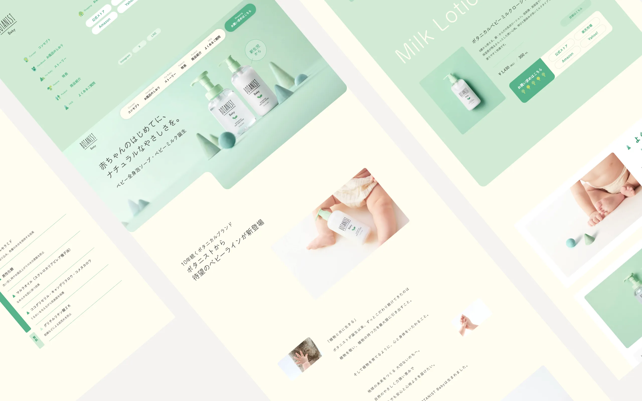 I-neコーポレートサイトとBOTANISTブランドサイトのリニューアルに引き続き、新生児から使えるボタニストの新ラインのランディングページ制作を担当させていただきました。 いそがしいママさん・パパさんにも楽しんでもらえることや、情報の得やすさ・読みやすさに重点を置いて進めていきました。 全体ではボタニストらしく「自然」を感じられる色合いやモチーフを可愛らしくアニメーションし、公開後に追加した『お風呂のしおり』ではスマホでささっと見られる使いやすさを目指しました。