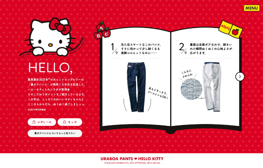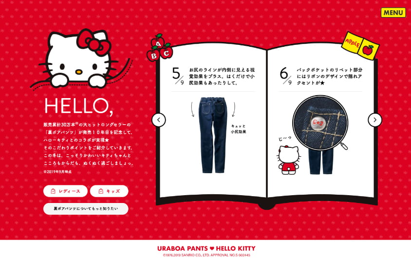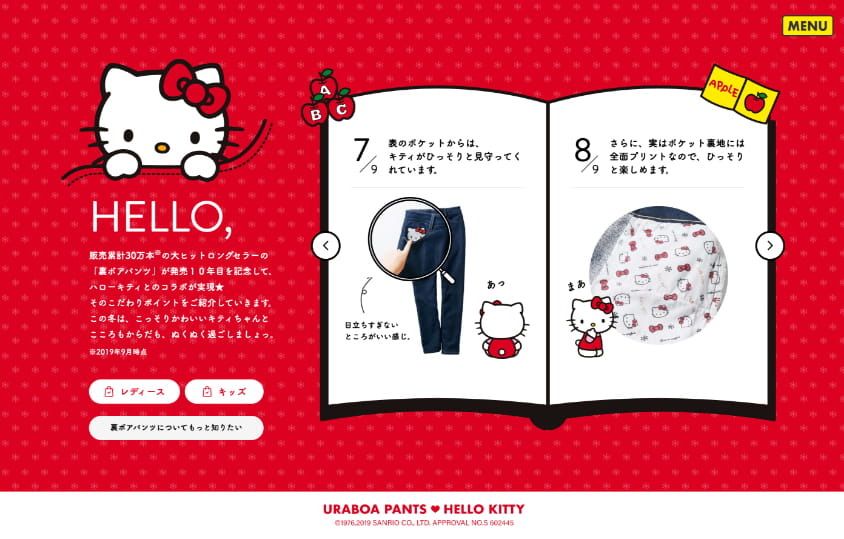 ハローキティとコラボレーションを行った商品企画の特設サイトです。キティの世界観を演出しながら、「本をめくる」という演出を行うにあたって、Reactを採用してSPAとして開発しました。モバイルとPCでマウントするコンテンツをダイナミックに切り替えた点もポイントです。